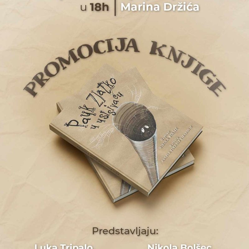 U petak, 15. prosinca, u 18 h u Dječjoj knjižnici Marina Držića održat će se predstavljanje slikovnice Pauk Zlatko u usisivaču. Slikovnicu će predstaviti Luka Tripalo, njezin recenzent, i Nikola Bolšec, njezin autor.