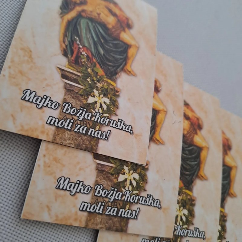 Magnetić s likom Majke Božje Koruške iz istoimene križevačke crkve dimenzija 7 x 5 cm.