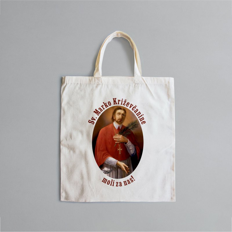 Platnena vrećica s likom sv. Marka Križevčanina dimenzija 30 x 40 cm.